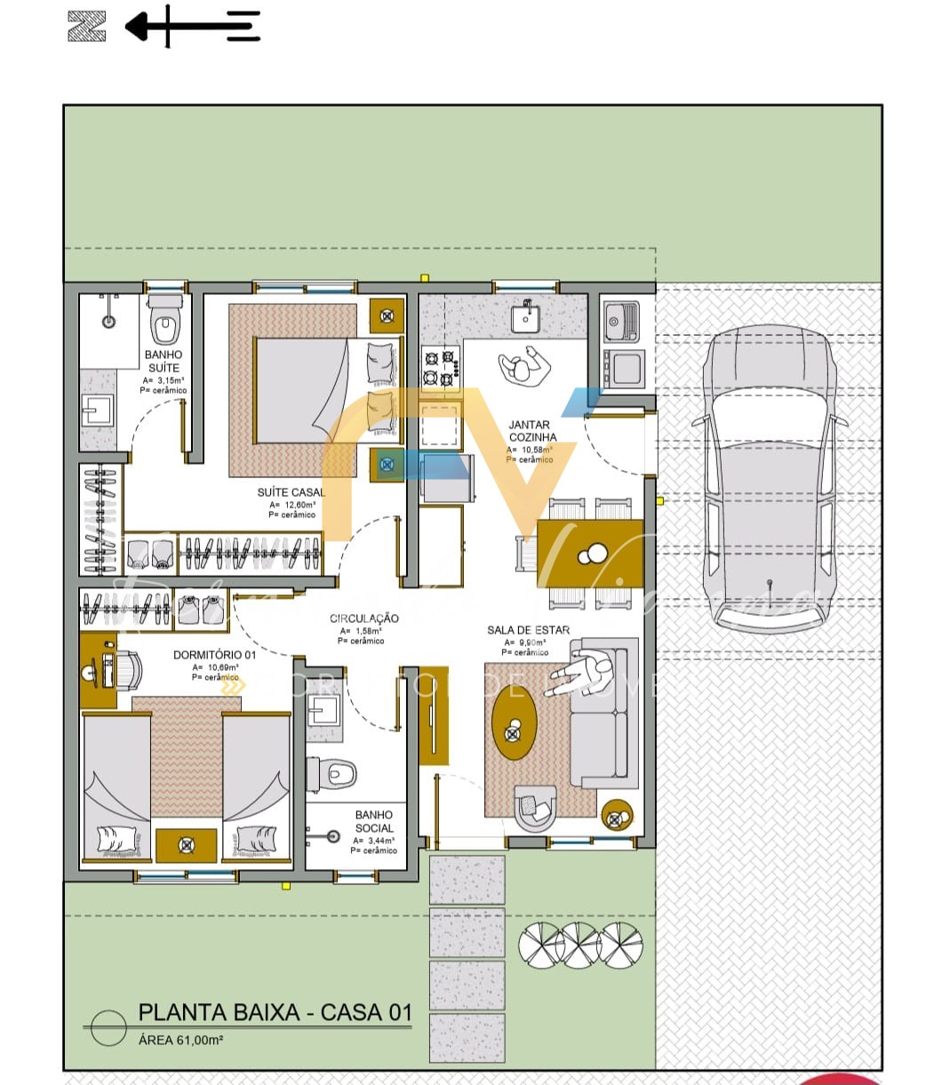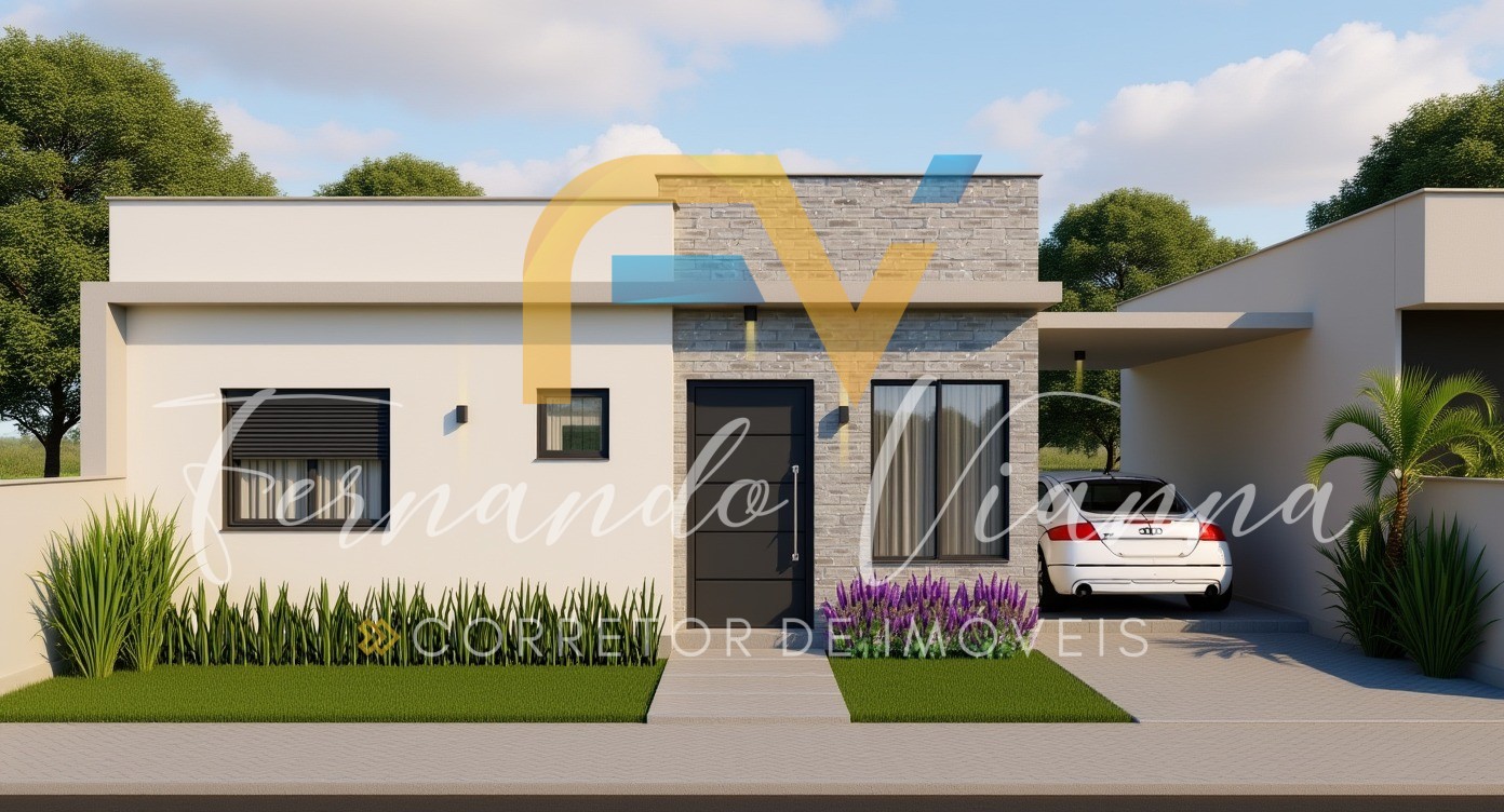 Distribuição: 01 suíte + 01 dormitório, sala de estar/jantar integradas com a cozinha, área de serviço, banheiro social e garagem coberta para 01 veículo.